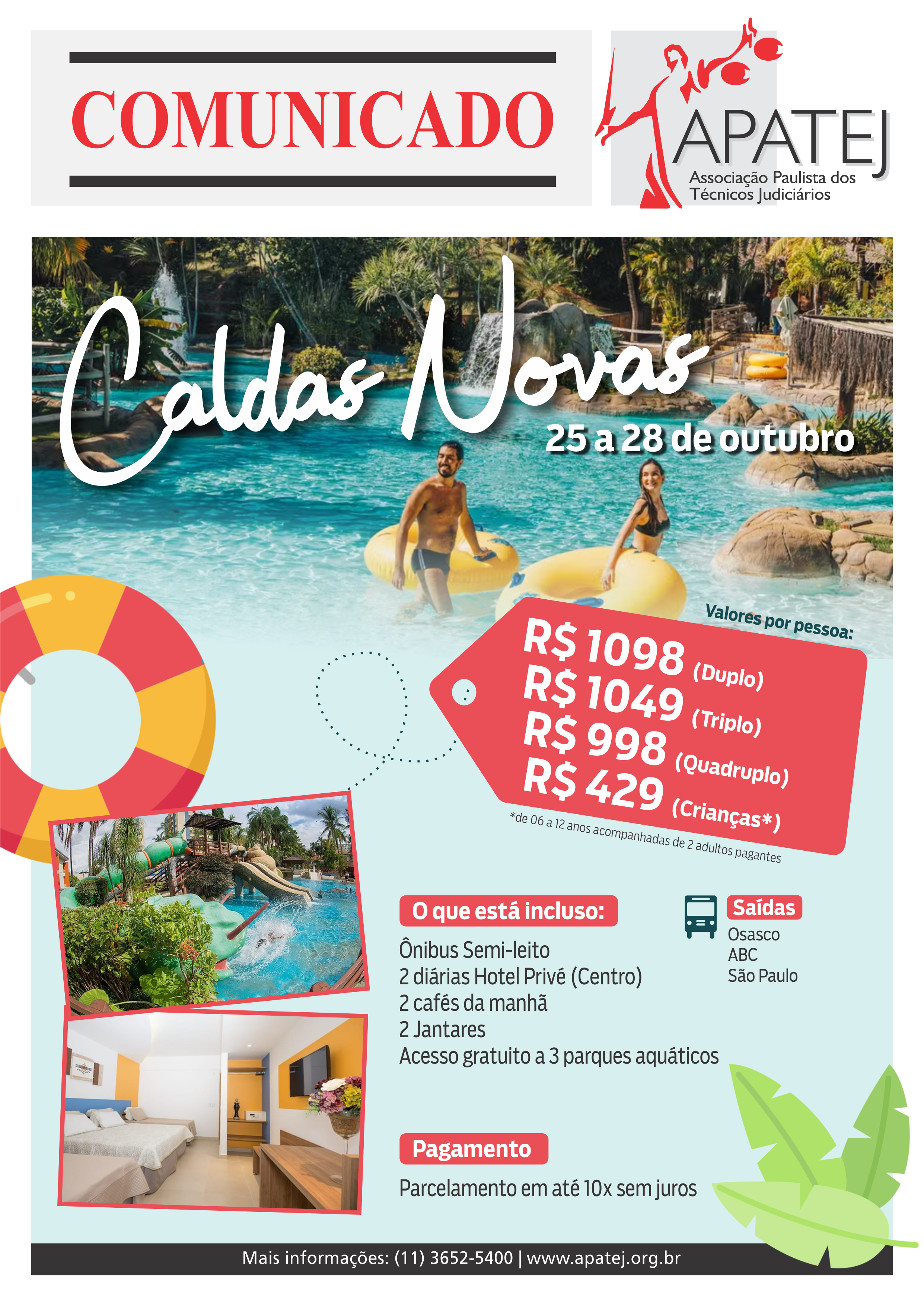 A Apatej tem o prazer de anunciar uma viagem inesquecível, desta vez para comemorar o Dia do Servidor Público: um passeio a Caldas Novas, Goiás, um dos destinos mais fascinantes do Brasil.