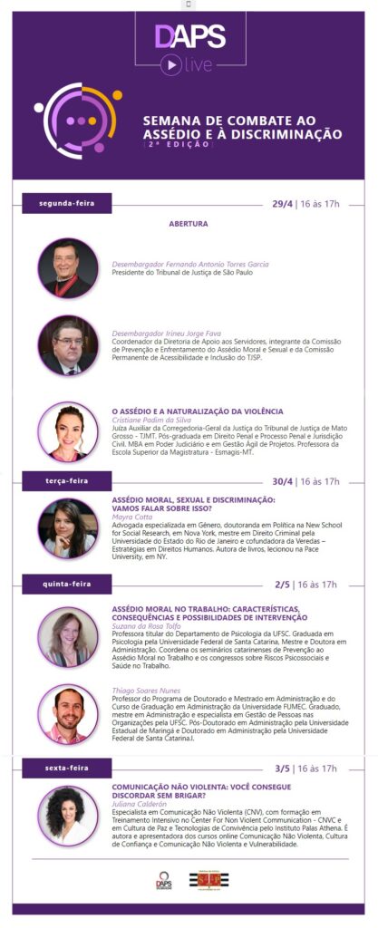 A Diretoria de Apoio aos Servidores (DAPS) realiza a partir desta segunda-feira, 29/04, a 2ª Edição da Semana de Combate ao Assédio e à Discriminação do TJ-SP.