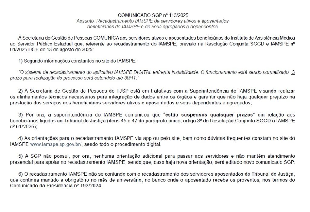 A informação foi divulgada pela Secretaria de Gestão de Pessoas (SGP) do TJ-SP, através do Comunicado SGP nº 113/2025. A medida ocorre em meio a tratativas entre a SGP e a Superintendência do Iamspe, que visam alinhar tecnicamente a integração de dados entre as instituições para garantir a continuidade e a qualidade dos serviços prestados aos beneficiários.