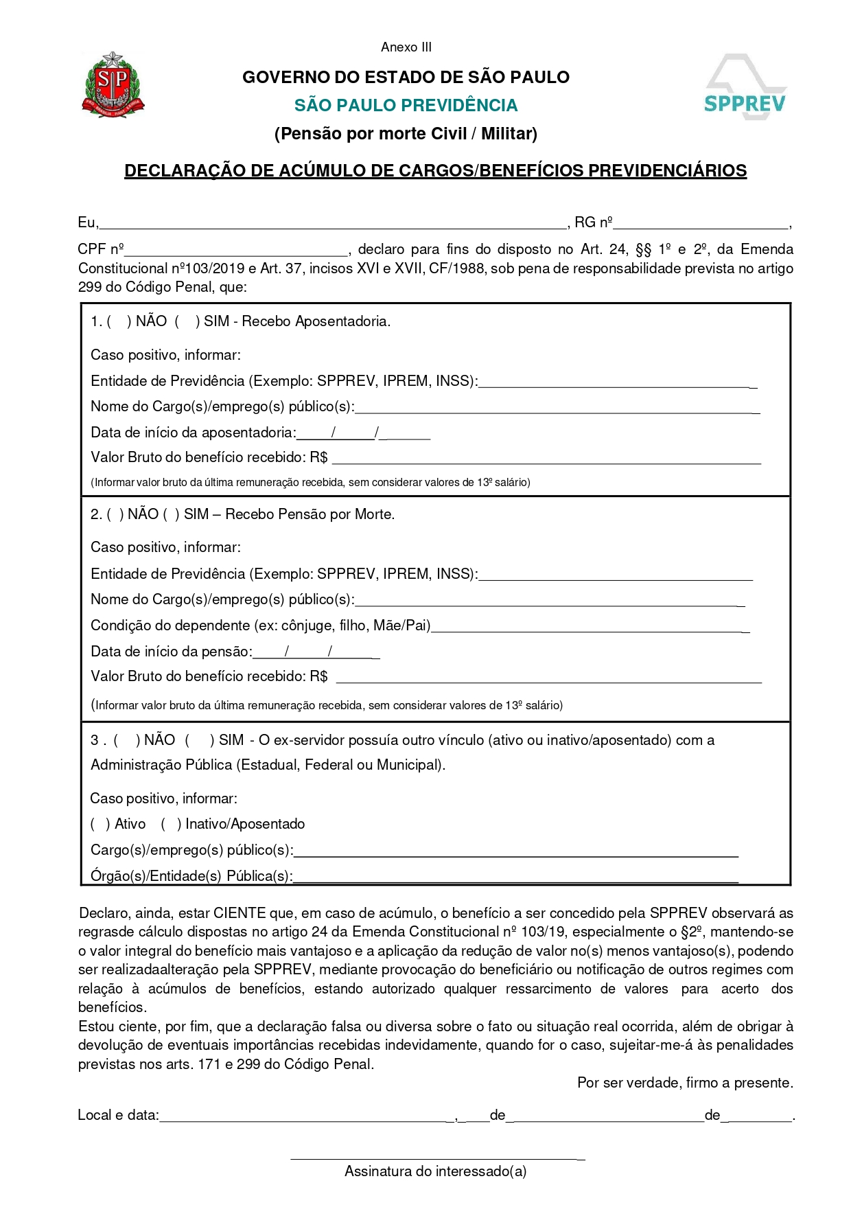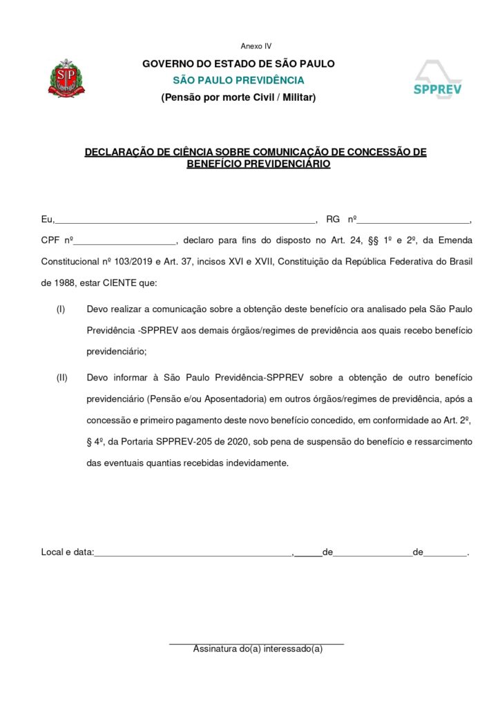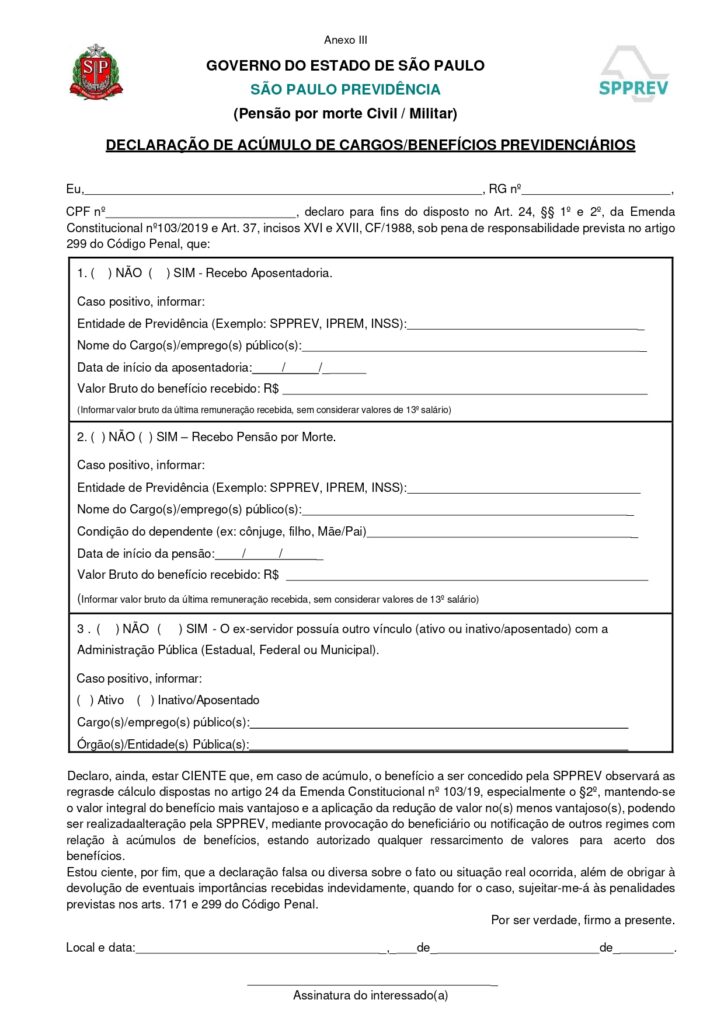 A SPPREV disponibilizou no dia 14/11 uma atualização da “Declaração de Acúmulo de Cargos/Benefícios Previdenciários”, documento essencial para a solicitação de pensão por morte civil e militar.