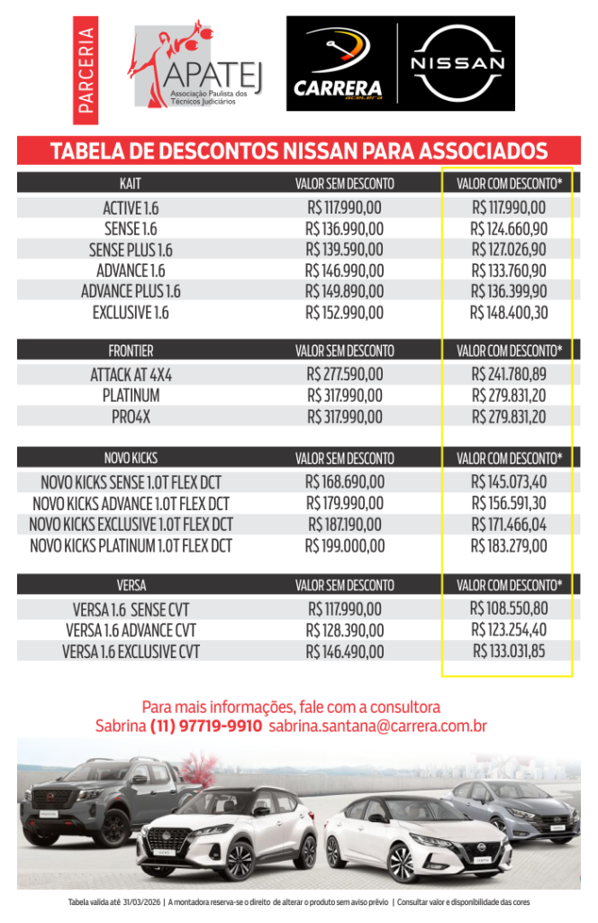 A Associação Paulista dos Técnicos Judiciários (Apatej) continua a oferecer vantagens exclusivas para seus associados na aquisição de veículos Nissan. Em parceria com a Nissan Carrera, uma das principais concessionárias do país, os associados agora têm acesso a preços e condições especiais.